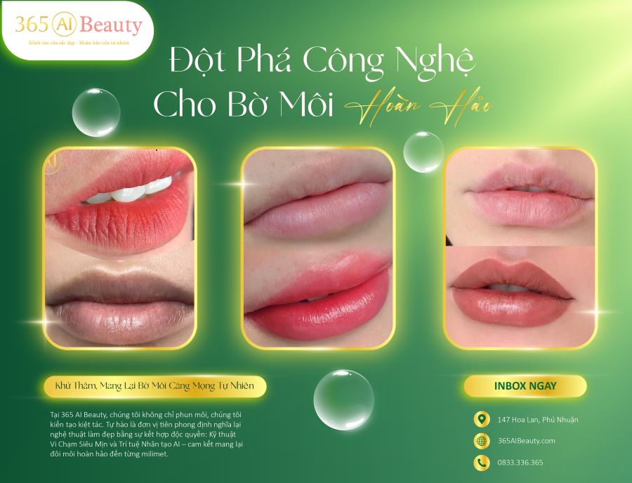 Một bờ môi căng mọng, hồng hào tự nhiên chính là "vũ khí" tối thượng giúp gương mặt bừng sáng sức sống mà không cần bất kỳ lớp trang điểm nào. Việc lựa chọn dịch vụ phun môi vi chạm khử thâm tại 365 AI Beauty không chỉ là một quyết định làm đẹp, đó là một sự đầu tư thông minh. Đầu tư để tiết kiệm thời gian mỗi sán, đầu tư để tự tin trong mọi khoảnh khắc, đầu tư vào sự an toàn với công nghệ AI và mực Organic.